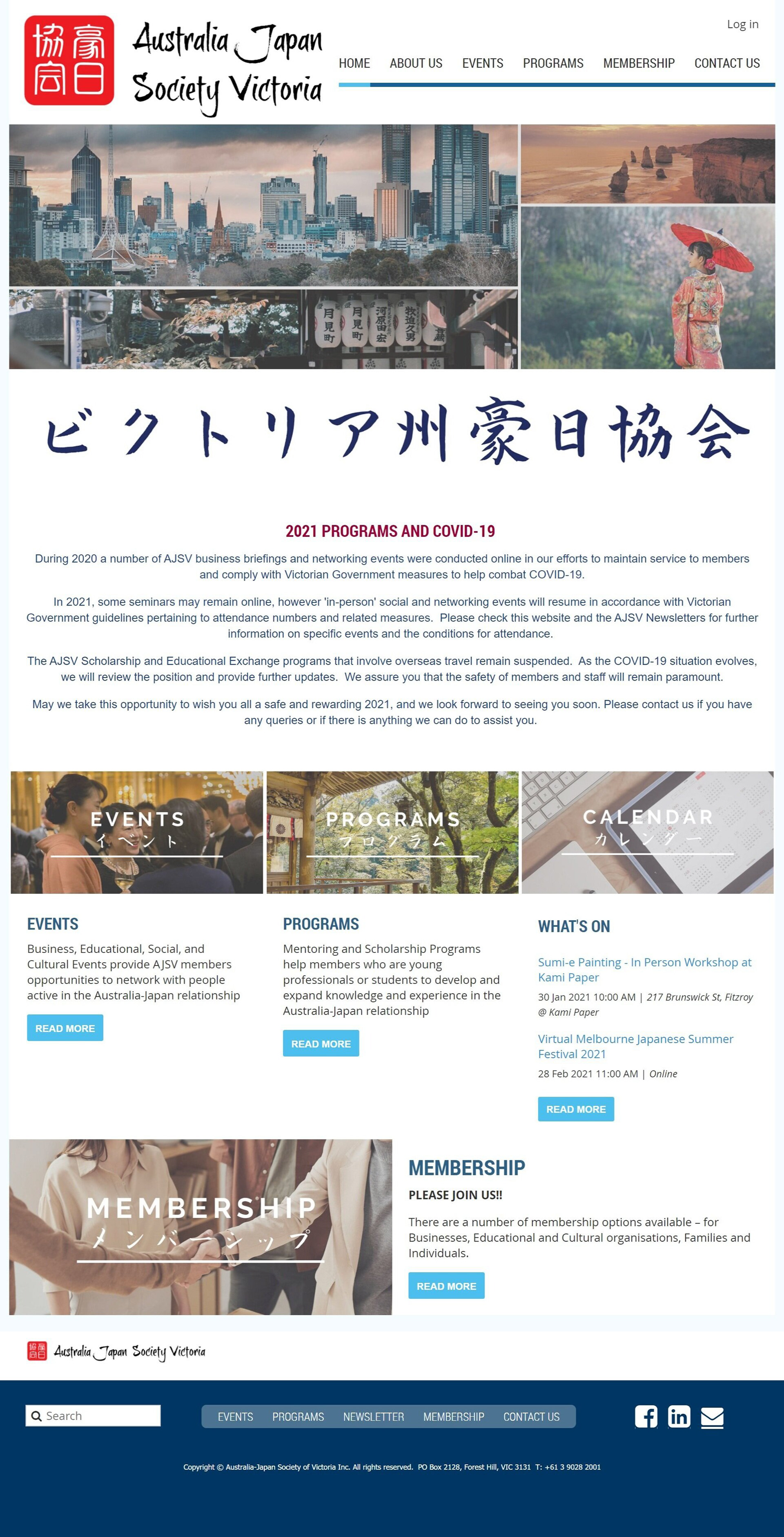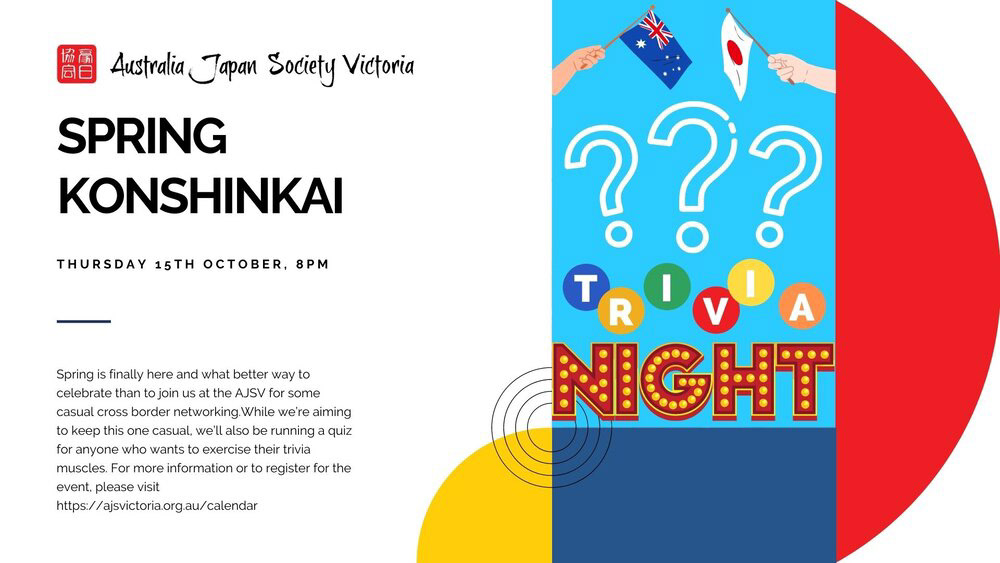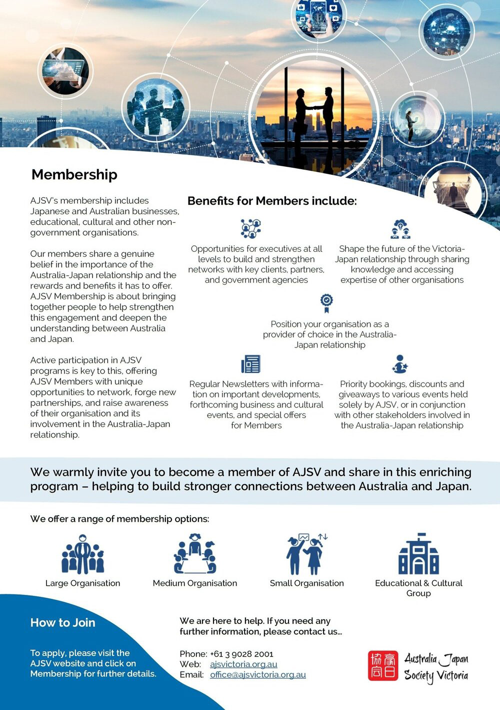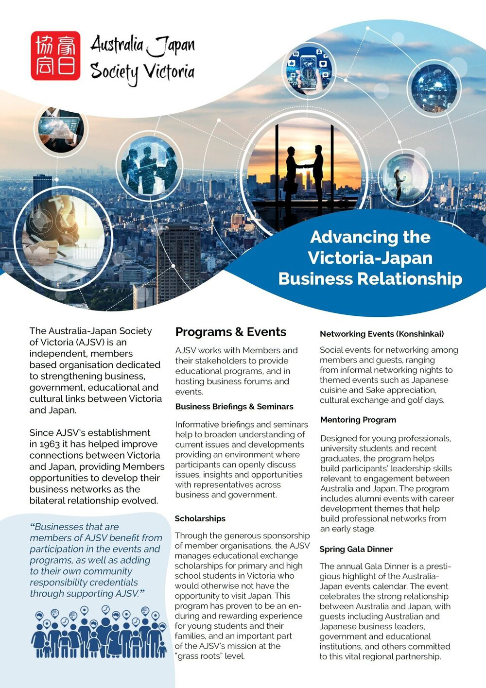 The Australia-Japan Society of Victoria (AJSV) was established in 1963 as an independent, non-profit organisation dedicated to strengthening business, government, educational and cultural links between Victoria and Japan.